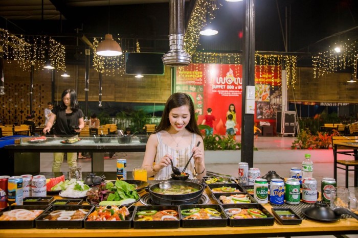 Nếu bạn đã chán phong cách gọi món truyền thống thì lựa chọn một bữa trưa theo phong cách buffet đồ nướng cũng là gợi ý hay ho dành cho bạn và gia đình nhé! Không gian quán rất rộng đủ để phục vụ các đoàn khách, các hộ gia đình hay nhóm bạn đều thích hợp. Đến đây thường thức bữa trưa bạn có thể thưởng thức các món lẩu hoặc nướng với nguyên liệu đa dạng từ các món thịt bò hảo hạng đến các món hải sản tươi ngon từ vùng biển của Phan Thiết nhé.