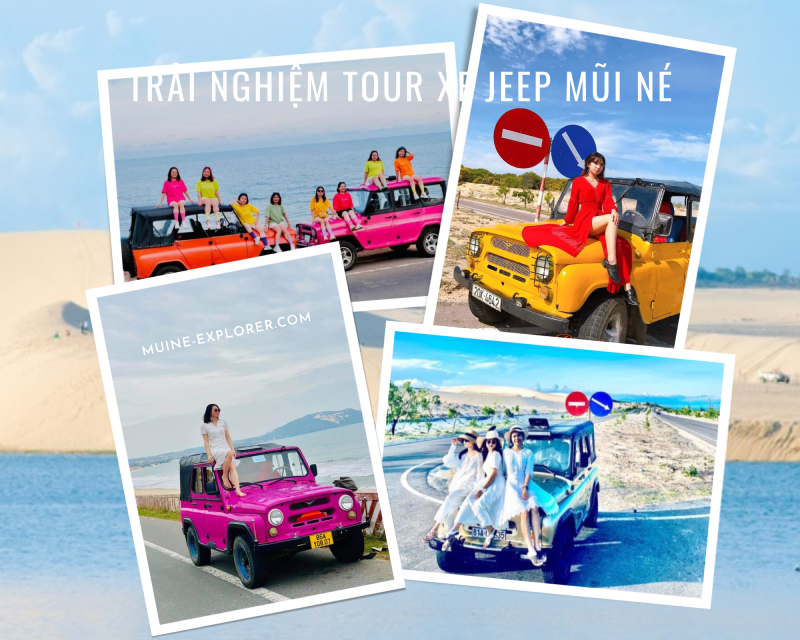 Lịch trình tour nửa ngày khám phá Mũi Né bằng xe Jeep sẽ đưa bạn tham quan 4 địa điểm du lịch nổi tiếng nhất là Bàu Trắng (Đồi Cát Trắng), Đồi Cát Bay (Đồi Cát Đỏ), Làng Chài và Suối Tiên. Thuê xe Jeep Mũi Né, tour sẽ đón bạn tại các khách sạn, resort thuộc khu vực Hàm Tiến - Mũi Né, ngồi trên những chiếc xe Jeep sắc màu, tài xế sẽ lái xe đưa bạn đi qua cung đường bao biển Hòn Rơm tuyệt đẹp. Du khách có thể dừng lại check-in chụp hình cạnh biển để lưu lại một loạt bức ảnh đẹp để đời.