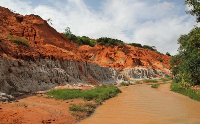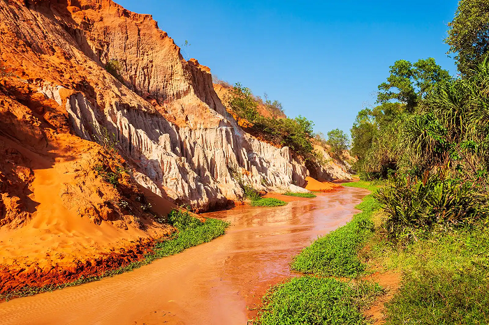 Địa điểm nổi tiếng nữa của tour xe jeep Mũi Né chính là Suối Tiên, dòng nước ở đây được nhuộm màu phù sa nên còn có tên gọi khác là Suối Hồng. Dòng suối uốn lượn giữa một bên là bức tường cát sừng sững hai màu đỏ - trắng, bên còn lại là cây cỏ xanh tươi. Không chỉ vậy những khóm hoa dại khoe sắc điểm xuyết bên dòng nước càng làm cho khung cảnh thêm thơ mộng.