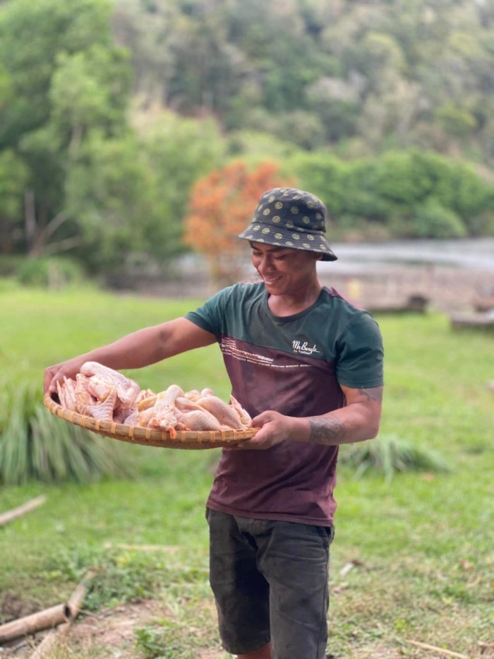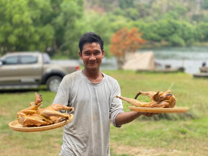 Món chính gồm: Cơm lam ống tre, nai xào rau rừng (lá bép), gà nướng