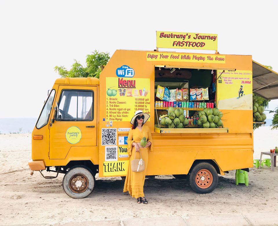 Xen lẫn giữa màu trắng tinh khôi của đồi cát là hình ảnh chiếc xe màu vàng cam Bàu Trắng Journey nổi bật, hút mắt. Đây là chiếc xe bán nước giải khát nằm trên cung đường Bàu Trắng, bạn có thể mua nước mang đi hoặc ngồi lại bên những chiếc ghế cốc uống nước dừa tươi dừa Rạng Mũi Né mát ngọt.
