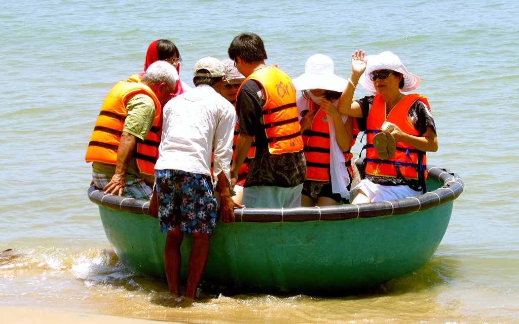 Những du khách thích mạo hiểm thử thuyền thúng để kiểm tra kỹ năng chèo của mình tại Mũi Né. Những ai không dám bước chân lên thuyền thúng có thể đứng trên bờ và chụp hình từ xa.