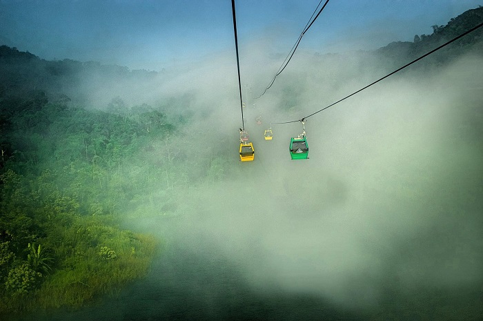 Dịch vụ cáp treo lên núi Cấm dành cho ai có sức khỏe không tốt hoặc thời gian hạn hẹp để leo núi. Du khách chỉ mất khoảng 15 phút đi cáp treo là có thể lên tới đỉnh núi. Ngồi trong cáp treo, bạn có thể đưa tầm mắt nhìn rõ cả một khoảng trời An Giang từ trên cao xuống tuyệt đẹp.