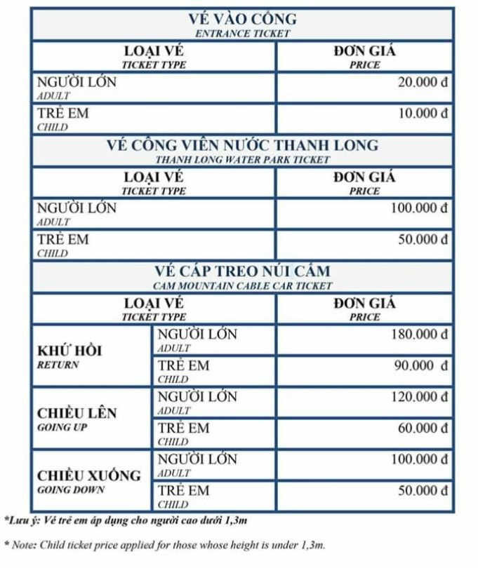 Bảng Giá Vé các Dịch Vụ của Khu du lịch Lâm Viên Núi Cấm