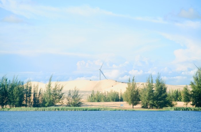 Bàu Trắng Mũi Né được bao quanh bởi những triền cát trắng, nắng và gió. Từ trên đồi cát nhìn xuống mặt hồ phẳng lặng và lấp lánh phản chiều những tia nắng sáng. Khung cảnh trước mặt hiện ra rất trữ tình với những tua-bin điện gió khổng lồ bao quanh. Đây là địa điểm được khá nhiều bạn trẻ, đôi uyên ương, nghệ sỹ, nhiếp ảnh gia lưu lại những album ảnh để đời. Đồi cát trắng còn là điểm ngắm hoàng hôn tuyệt đẹp nếu bạn ra đây vào buổi chiều.