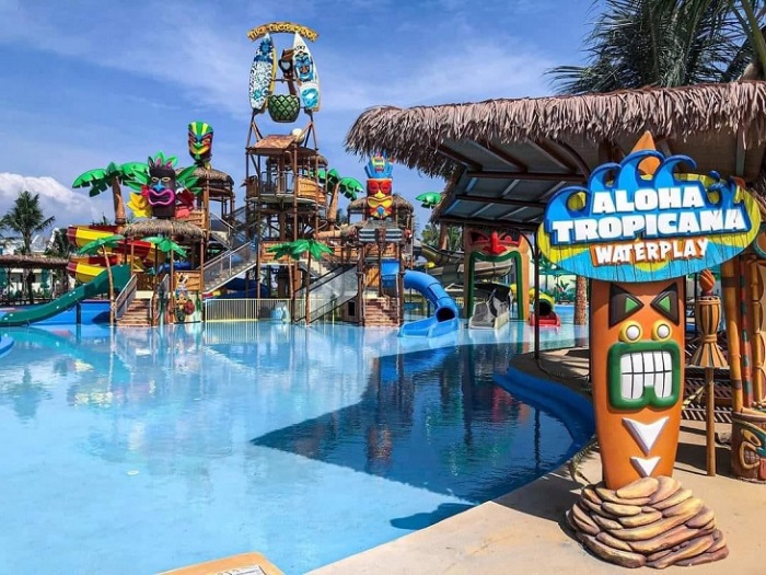 Review công viên nước Tropicana Park Hồ Tràm, du khách mua vé Tropicana sẽ được hòa mình vào những trò chơi mạo hiểm trên biển, cảm nhận sức mạnh đại dương và sóng biển trong hồ tạo sóng, check in phong cách văn hóa Tiki trẻ trung, vui nhộn.