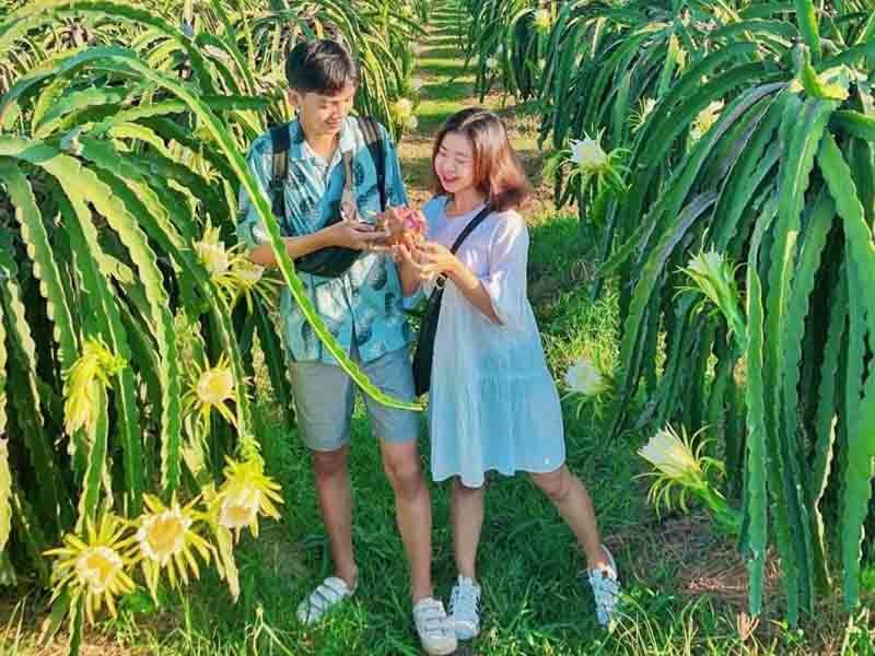 Đến đây, du khách không chỉ được tham quan vườn thanh long mà còn được tham gia trải nghiệm những hoạt động về quy trình trồng và chăm sóc cây thanh long.